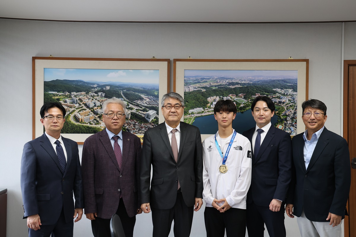 9월 29일, 지난 7월 독일에서개최된 '2025 라인-루르 하계세계대학경기대회(유니버시아드대회)' 태권도 품새 부분 단체전 금메달을 차지한 조호연(국제스포츠학부 태권도전공, 1학년) 선수를 격려하고 축하의 인사를 전하였다.