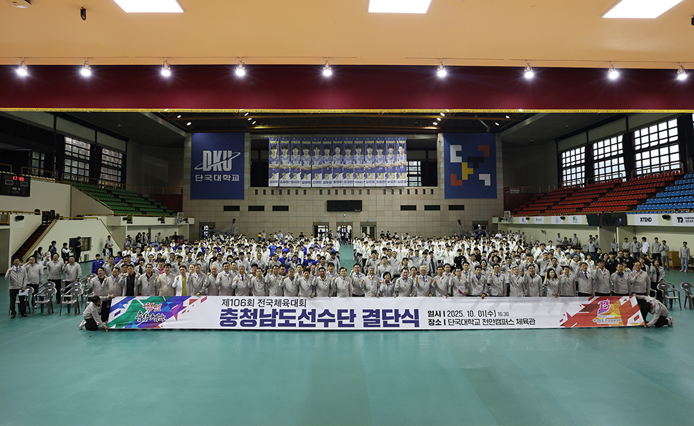 ‘제106회 전국체육대회’에 출전하는 충청남도 선수단의 결단식이 천안캠퍼스 체육관에서 열렸다. △ 결단식 단체사진 지난 1일(수) 오후 4시 천안캠퍼스 체육관에서는 오는 17일부터 23일까지 부산광역시에서 열리는 ‘제106회 전국체육대회’의 필승을 다짐하는 결단식이 열렸다. 결단식에는 백동헌 천안부총장, 김태흠 충남도지사, 김지철 충남교육감과 선수단 등 500여명이 참석해 자리를 빛냈다. △ 전국체전에 참가하는 우리 대학 선수들이 결단식에 참가했다(파란 유니폼). 백동헌 천안부총장은 우리 대학 선수들을 격려하며 “단국의 스포츠 정신과 팀워크를 발휘해 좋은 성적을 거두기를 기대한다”며 “단국 구성원 모두가 여러분의 도전을 응원하겠다”고 했다. △선수단장이 선수단 기를 흔들고 있다. 김태흠 충남도지사는 “충남은 많은 메달을 획득하며 전국체전 상위권을 지켜왔다”며 “이번 대회에 역대 최대 규모의 선수단을 파견하는 만큼, 전국 3위를 목표로 하자”고 선수단을 격려했다. △김태흠 지사가 선수들을 격려하는 모습 이번 전국체전에 충청남도는 50개(정식 48, 시범 2) 전 종목 출전을 위해 역대 최대 규모 (선수 1359명, 임원 617명)의 선수단을 꾸렸다. 우리 대학에서는 야구, 농구, 조정, 씨름, 여자농구, 배구, 볼링, 소프트볼 등이 충남 대표로 참여한다. #단국대 #전국체육대회 [대학뉴스 제보] 죽전 홍보팀 : 031-8005-2032~5, 천안 홍보팀 : 041-550-1061
